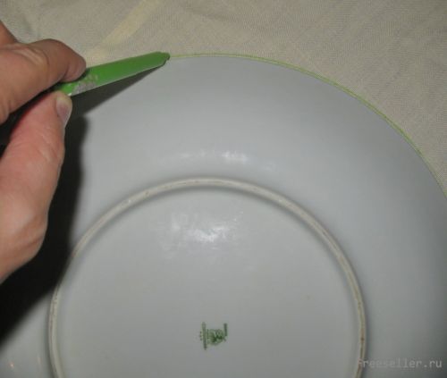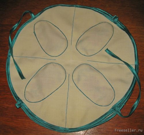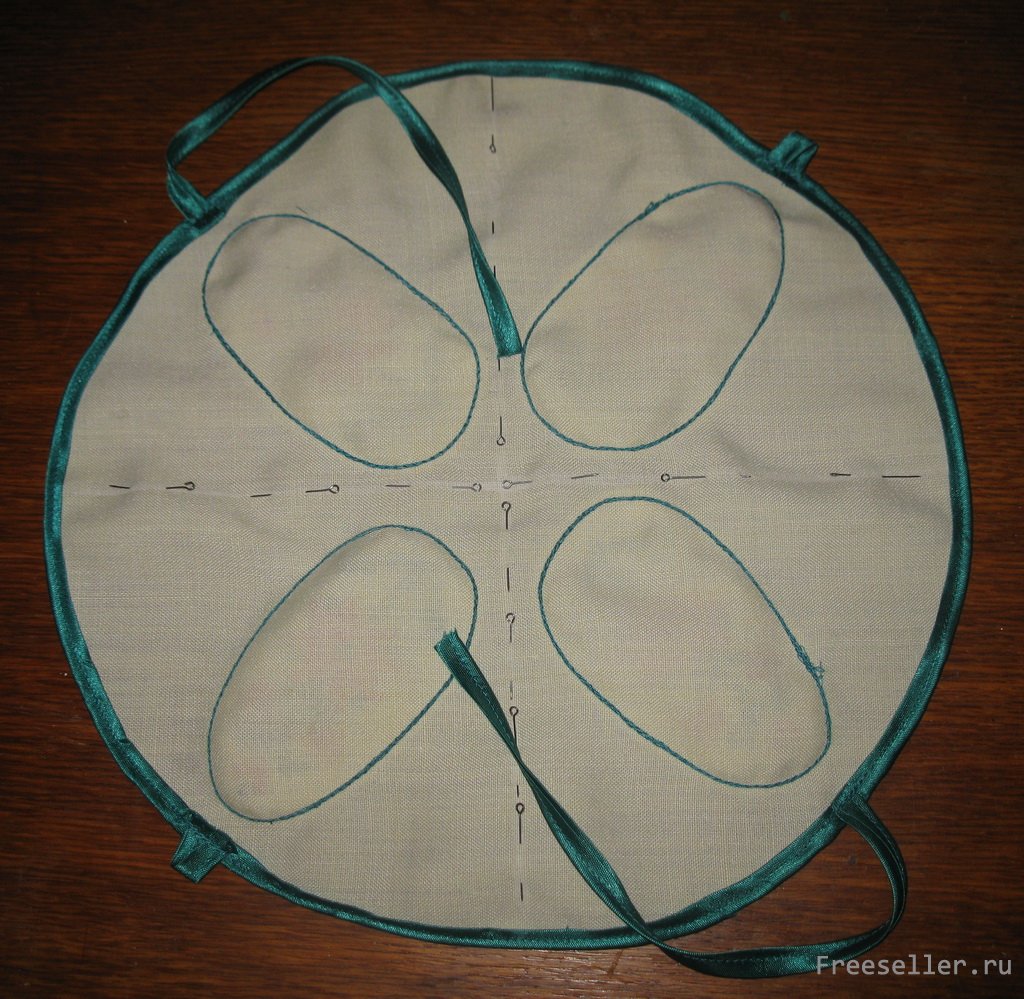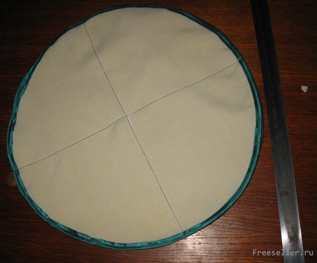 1) делаем выкройку 3 кругов на ткани при помощи большой тарелки либо можно с помощью циркуля начертить круг (диаметром 30 см) на бумаге, а затем использовать его как шаблон для переноса на ткань;
