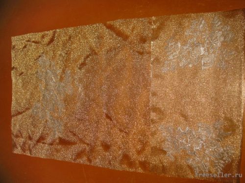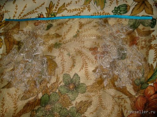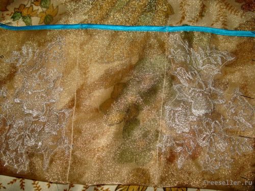 1) вырезаем прямоугольник из органзы (длина равна длине стебля цветов, ширина - ширине 2-3 бутылок + запас на окантовку и строчку), элементы цветочного кружева;