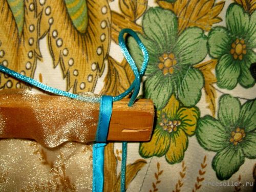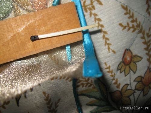 6) протягиваем через одно отверстие шнур, завязываем узел, прижигаем, чтобы не сыпался, обворачиваем брусок тканью с запасом на строчку и на том же расстоянии прожигаем потушенной спичкой отверстие (края дырочки на ткани не будут сыпаться), протягиваем в него шнур;