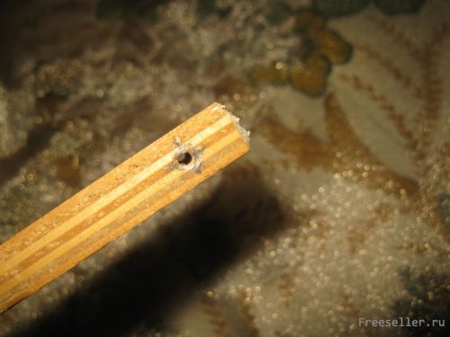 5) дрелью просверливаем 2 отверстия в деревянном бруске по толщине;
