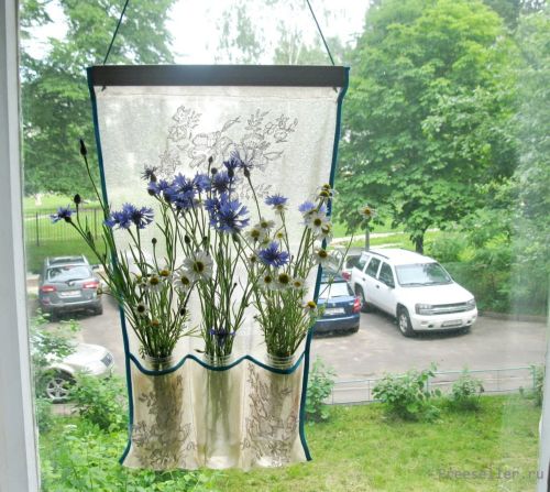 Все. Конструкция готова. Остается повесить ее на окно, вставить бутылки с водой в карманы и, конечно же, оживить всю композицию цветами. Особенно хорошо будут смотреться простые полевые цветы - васильки и ромашки.