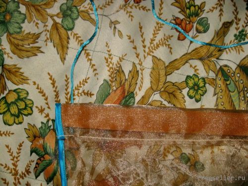 2) прикалываем симметрично кружева, отстрачиваем телесного цвета нитками, окантовываем край, где будут кармашки;