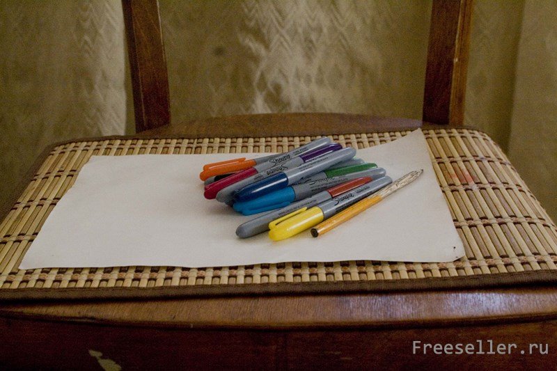 Затем рисуем горизонтальные линии чёрным фломастером. На том месте, где должна быть рука, линия приподнимается.