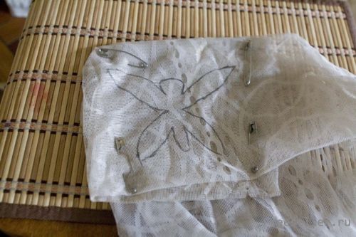 Складываем занавески в несколько раз, чтобы получилось за раз сразу много мотыльков. Обводим бумажное "лекало" и закрепляем булавками.