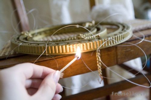 Привязываем леску на равном расстоянии друг от друга к каркасу. Закрепляем огнем чтобы узлы лески не развязались. Тут надо быть очень аккуратным и знать меру, чтобы не порвать случайно леску.