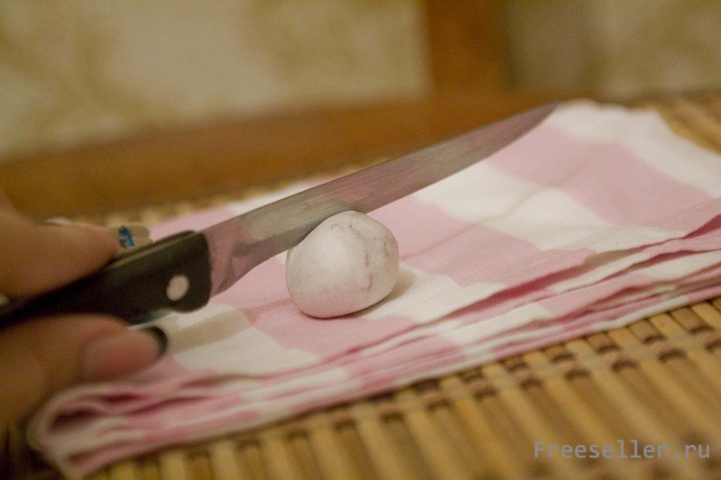 Раскатываем из полимерной глины шарик и разрезаем его пополам. Перед этим лучше всего помыть и обезжирить руки спиртом.