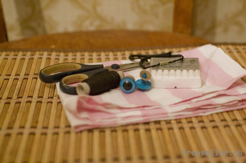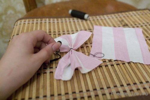 Пока глаза запекаются, вырезаем из ткани 2 прямоугольника. Из каждого делаем бантик, расшивая серединку прямоугольников.