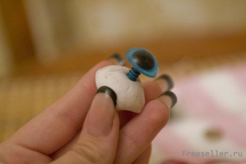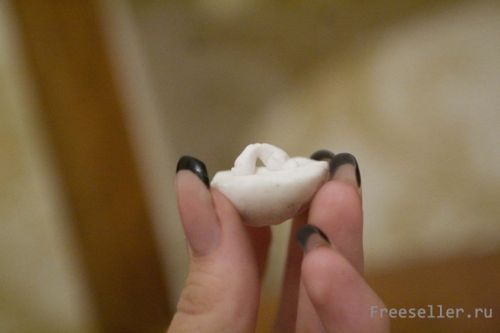 Берем ещё немного полимерной глины и раскатываем 2 тоненькие колбаски. Приделываем их к половинам шарика, образуя тем самым петельку.