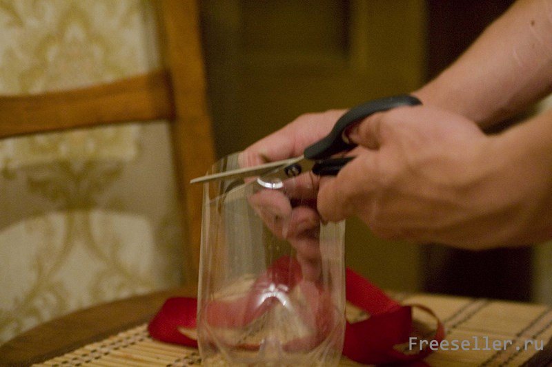 1) Отрезаем от пластиковой бутылкибутылки кольцо нужной ширины. В зависимости от Вашей руки, отрезаем ближе к горлышку или ближе к середине или донышку.
