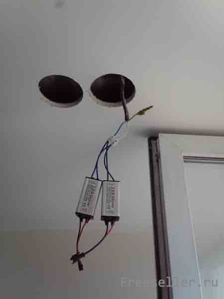 Электропроводка под точечные светильники уже была ранее сделана по проекту, потолок из ГКЛ собран и покрашен.
