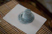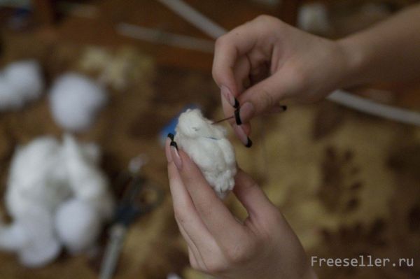 Далее делаем наши облачка. Плотно сжимаем вату и продеваем на нити.