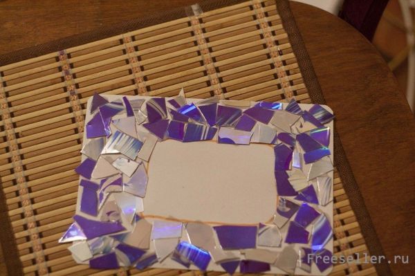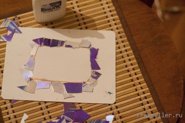 Начинаем обклеивать картон кусочками, вырезанными из CD дисков. Нужно начинать с краев, чтобы вышло равномерно.