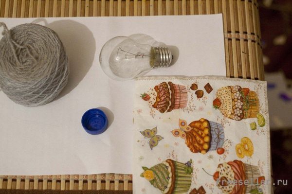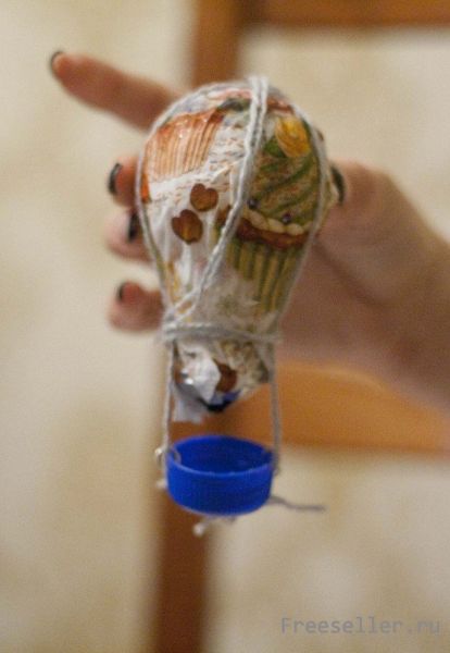 5) Прикрепляем нашу крышечку к лампочке с помощью верёвок. Готово. У нас получился воздушный шар.