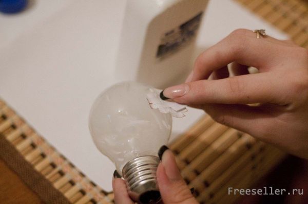1) Берем нашу лампочку и начинаем промазывать её клеем. Наносим клей равномерно по всей поверхности.