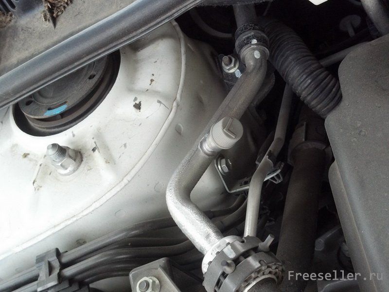 Откройте капот, найдите под капотом компрессор кондиционера, и магистраль низкого давления с колпачком для заправки.