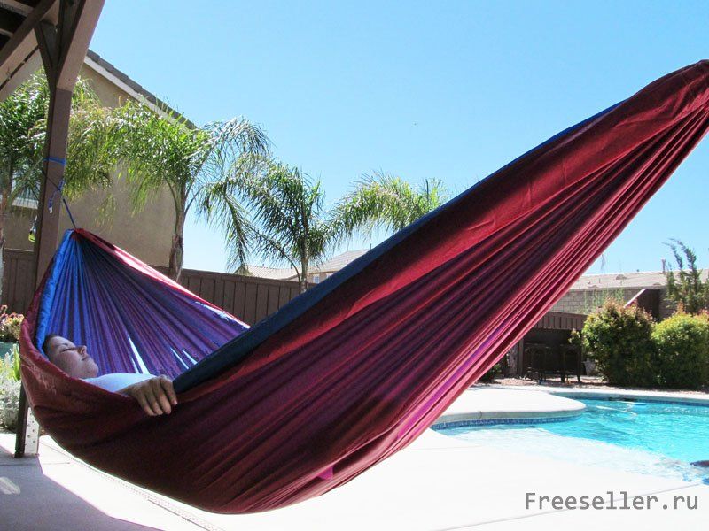 6) Готовый самодельный гамак можно повесить между деревьями или на брусья в деревянной беседке или веранде.