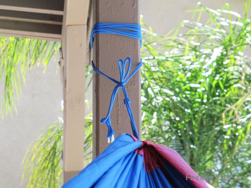 5) Протянуть шнуры с обоих концов полотна и завязать их крепким узлом для оформления формы гамака.