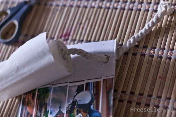 4) Засовываем верёвку в кассовую ленту и продеваем её в дырочки. Завязываем.