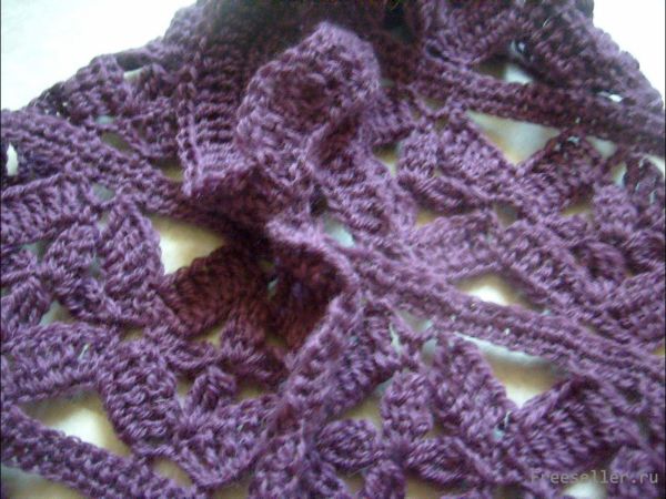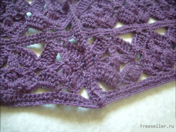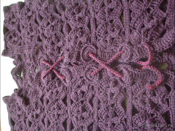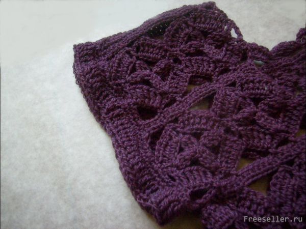 Обвязываем по кругу проймы. Горловину и края полочек обвязываем столбиками с накидом, а по низу жилета вывязываем ажурную канву с арками под бахрому.