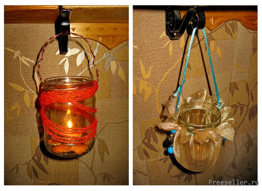 Фонари делаются из обычной 0,5 л банки, обтянутой блестящим шифоном или органзой и декорированной старыми порванными бусами или подвесками. Ткань закрепляется с помощью атласного крученого шнура, тесьмы или ленты, а можно просто обкрутить резьбу проволокой.