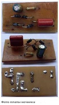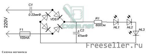 Ночник можно разделить на схему питания светодиодов и сами светодиоды. Схема питания работает следующим образом: Напряжение 220В подается через вилку на гасящий конденсатор С1 и предохранитель F1; далее оно выпрямляется диодным мостом VDS1 и сглаживается конденсатором С2.Далее через гасящий резистор подается на светодиоды.