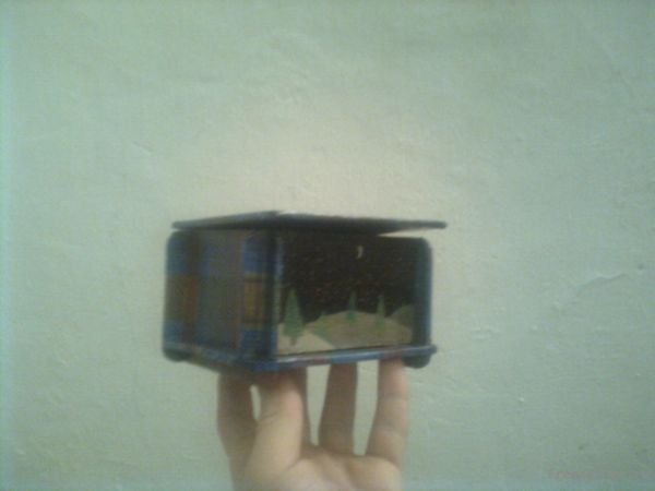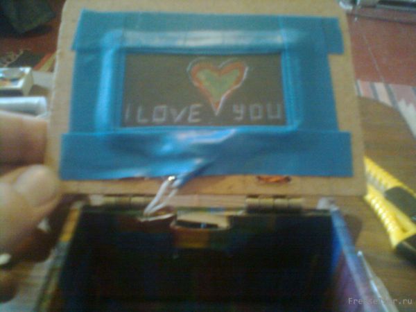 В крышке изнутри просверлили дырки под петли и рисуем нужный рисунок но лучше на темном фоне (так картинка будет ярче светится) но рисунок не до самих краев так чтоб следующая подсветка включалась когда закроется шкатулка.