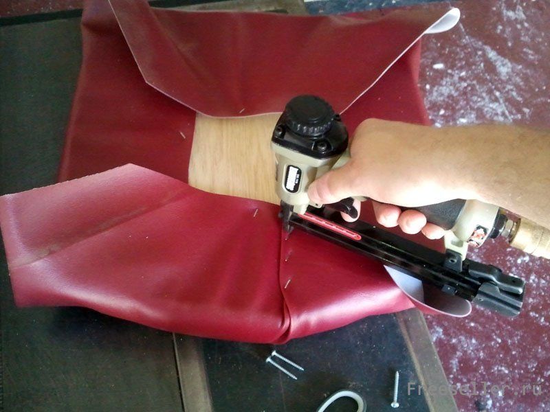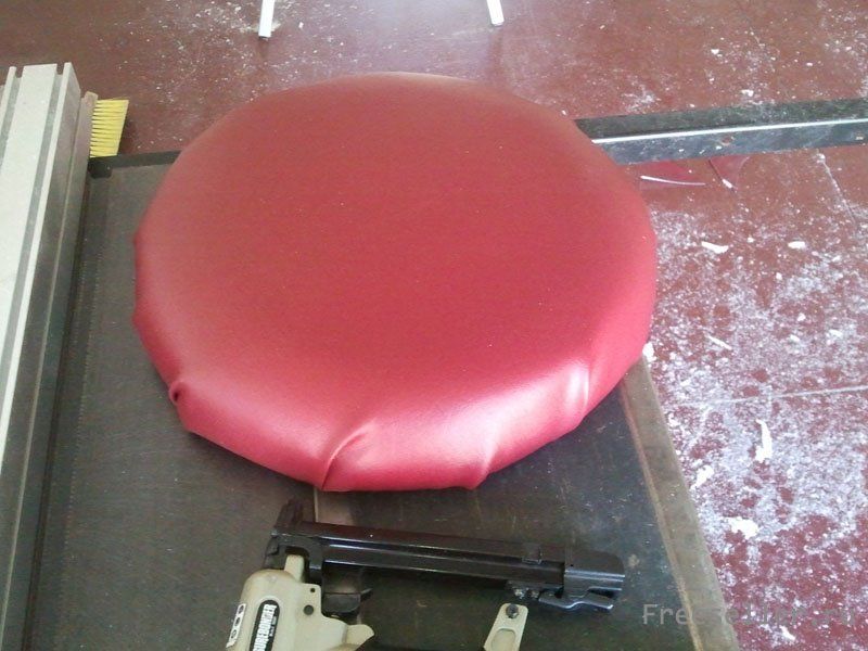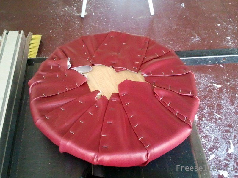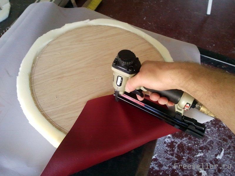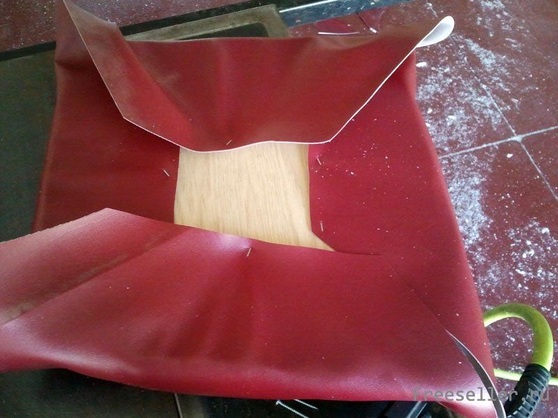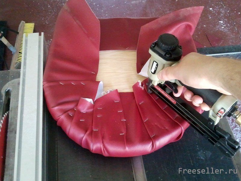 Положите сидушку на расправленное покрытие с обратной стороны обрежьте его лишнюю часть. Затем с помощью степлера для дерева прикрепите покрытие к деревянной основе.