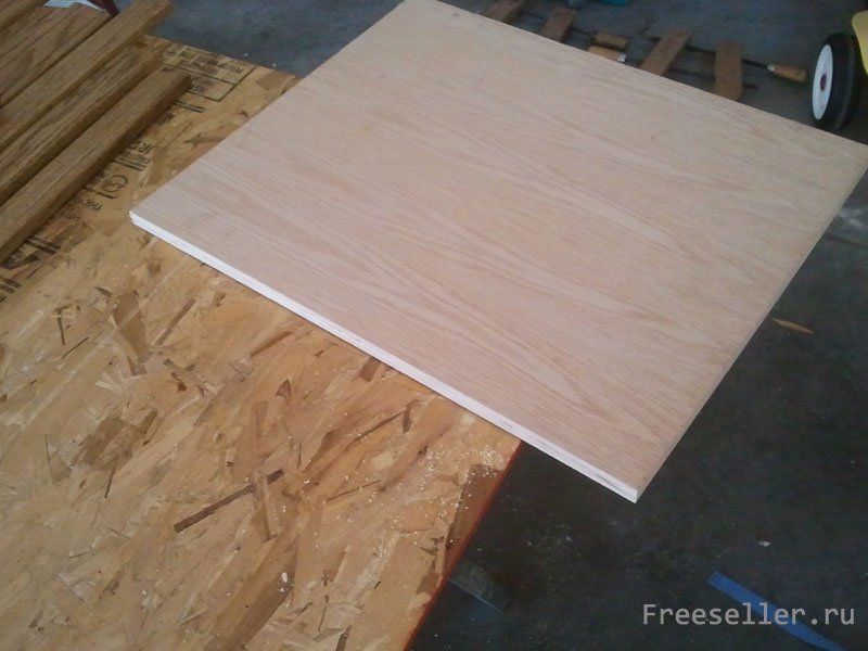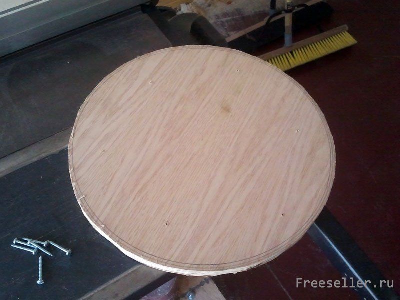 Теперь пришло время сделать сидушку для будущего стула. Для этого возьмите толстый лист фанеры и нарисуйте на нём круг. Диаметр вы можете определить сами. Главное, чтобы вам было удобно сидеть. Возьмите ленточную пилу и осторожно вырежьте с её помощью круг из фанеры. Отшлифуйте края вырезанной фанеры.