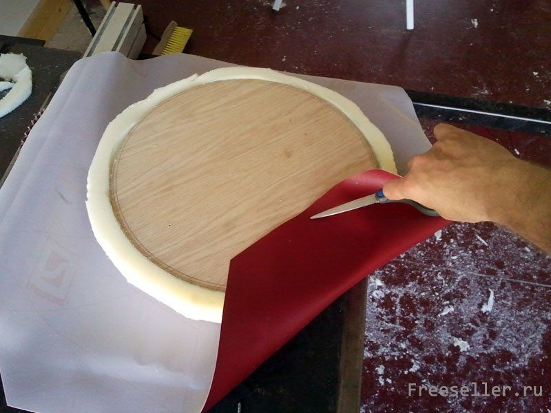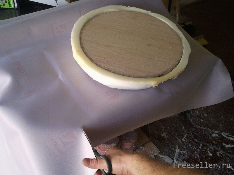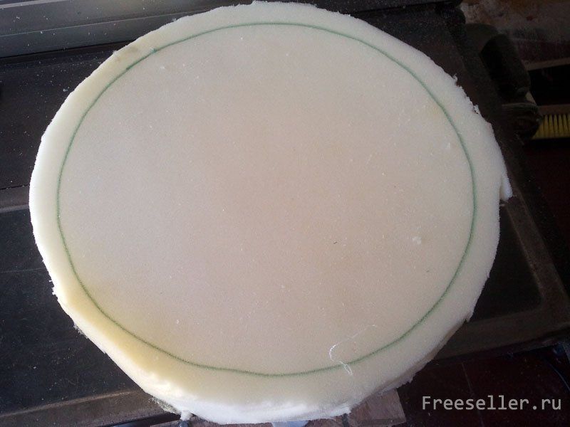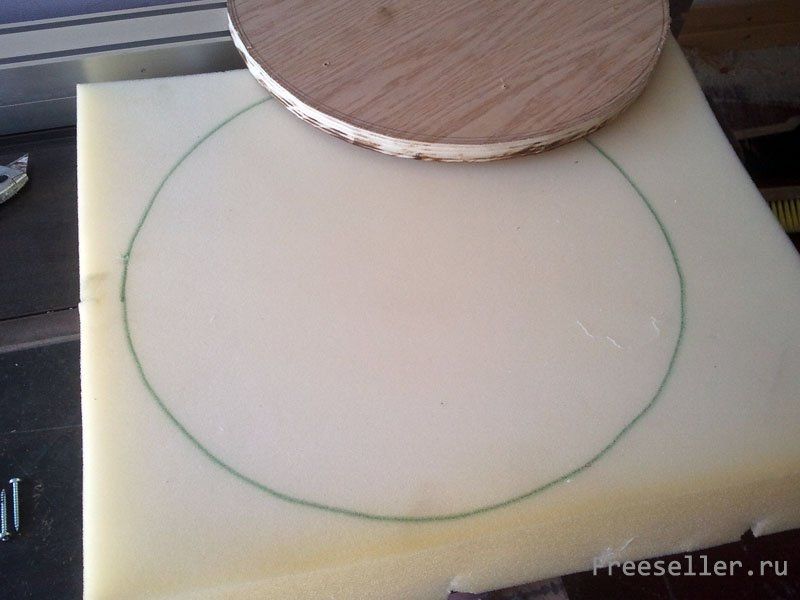 Возьмите кусок поролона, положите сверху на него круг фанеры и обведите вокруг него карандашом по контуру. Обрежьте излишки паралона. Обрезать нужно не строго по контуру. Оставьте где-то около пяти сантиметров паралона от края до контура.