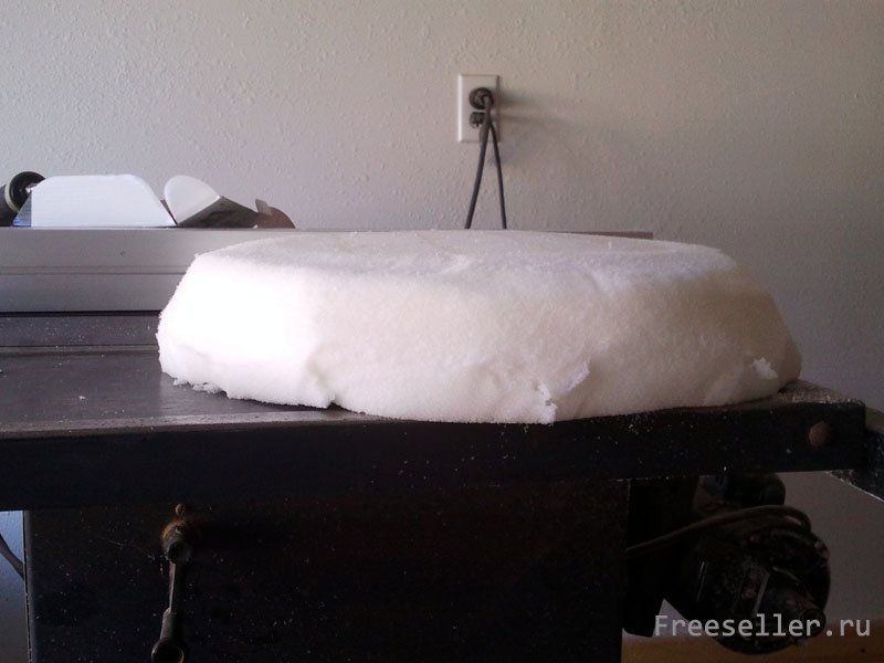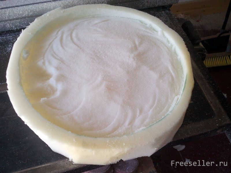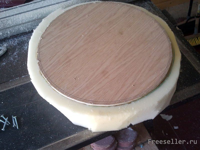Чтобы вырезать углубление в поролоне, воспользуйтесь угловой шлифовальной машинкой с алмазным кругом. В это углубление, затем вставляется круг фанеры.