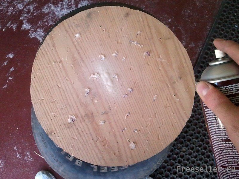 На круг фанеры и в углубление поролона нанесите клейкий спрей и затем склейте обе поверхности. Дайте клею высохнуть.