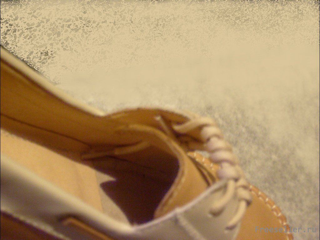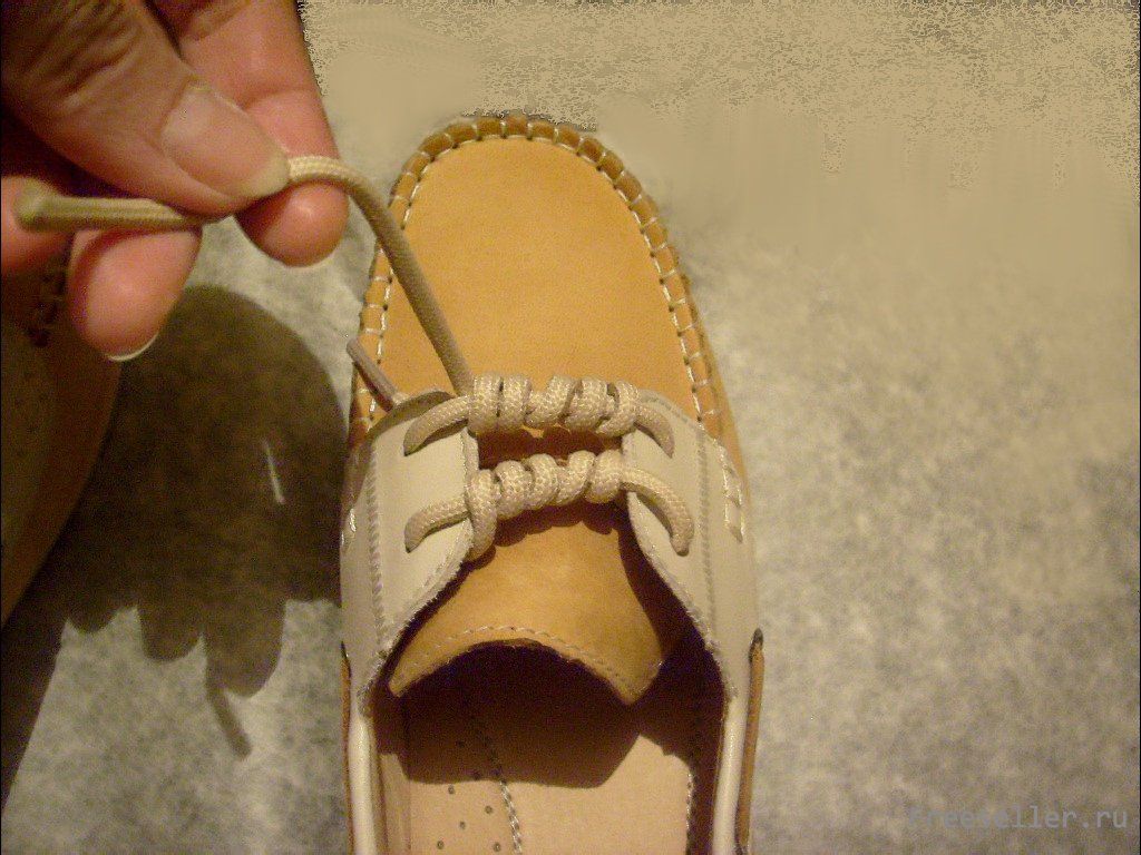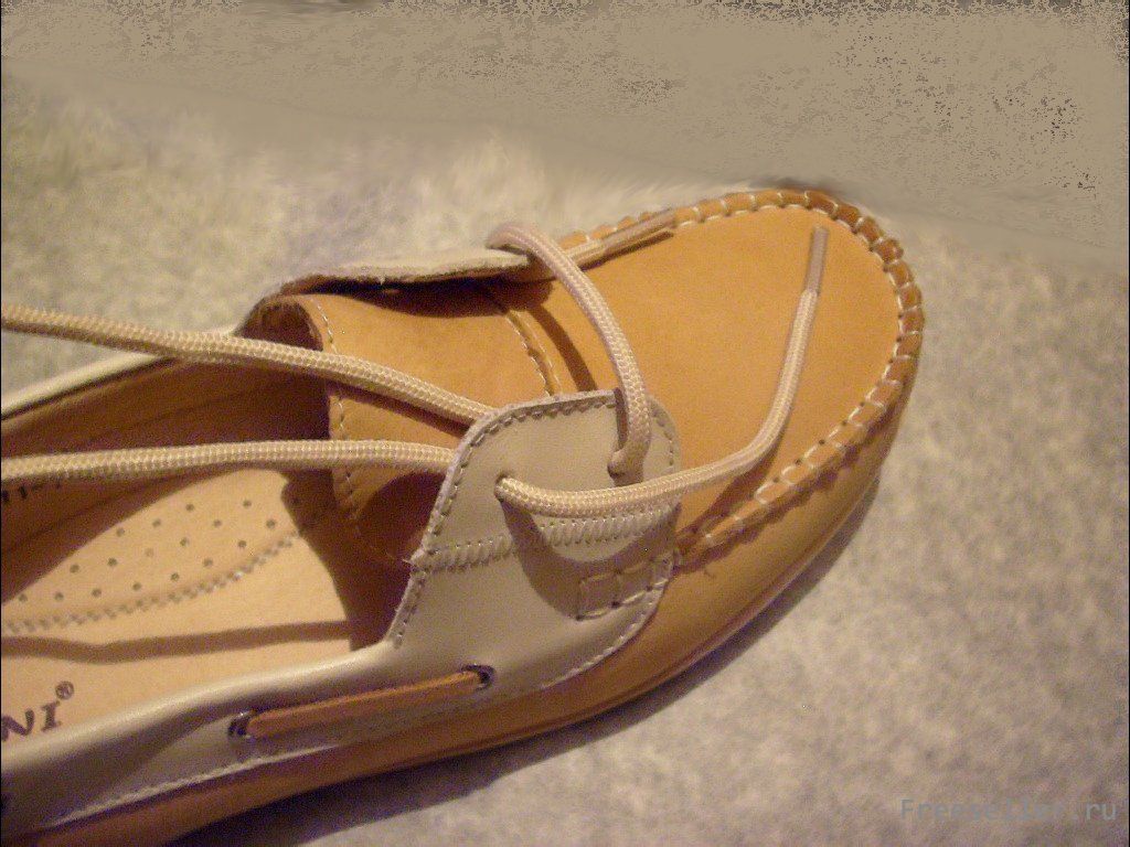 8. Таким же образом шнуруем второй башмак. Наши мокасины всего с двумя рядами "глазков". Если на вашей обуви их больше, то сначала нужно будет сделать все перемычки, а потом обвивать их свободным концом шнурка снизу вверх к начальной точке.