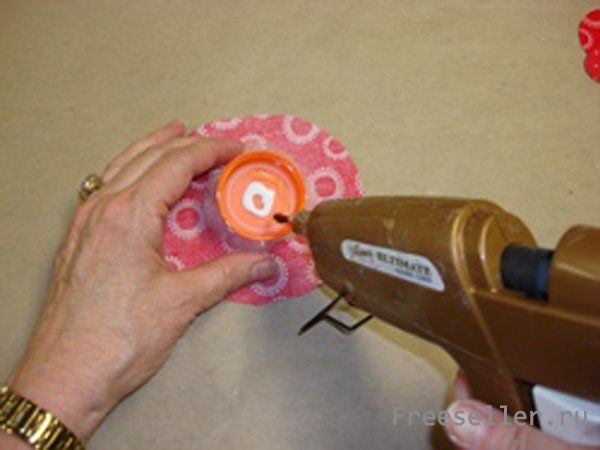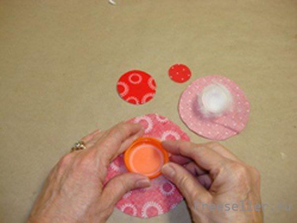 9) Теперь нанесите ещё немного клея на внутренние части крышечек (на самое дно) и вложите в каждую заготовленные круги, обклеенные тканью. Повторите тоже самое с деталью головы. ![]()