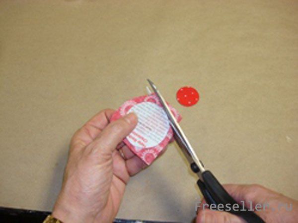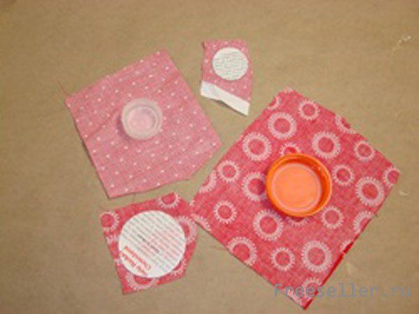 1) Возьмите кусочки картона и вырежьте два круга, которые будут равны диаметру крышечек. Теперь возьмите два вида красной ткани и вырежьте из них по два кусочка. Учтите, они по размеру должны быть больше, чем крышечки.