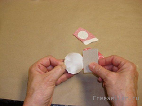 2) Нанесите на картонные круги слой клея и приклейте их к оборотной стороне ткани (она по цвету менее яркая). Учтите, круги должны быть приклеены к разным видам ткани. Если учитывать фотографии, то маленький кружок был приклеен к красной ткани в крапинку, а большой - к той, что в кружочек. Дайте клею высохнуть.