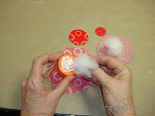 4) Нанесите небольшое количество клея на верхушки обеих крышечек. Возьмите вату скатайте ее в два не плотных комка и приклейте их к верхушкам крышечек.