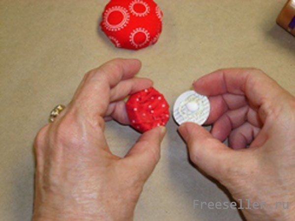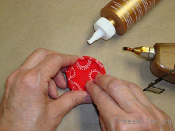 5) Нанесите немного клея на изнаночную часть ткани и приклейте к ней обе крышечки. Помните о том, что для головы (меньшей крышечки) использовать нужно ткань в белый горошек, а для тела (большей крышечки) - ткань с белыми кружками.