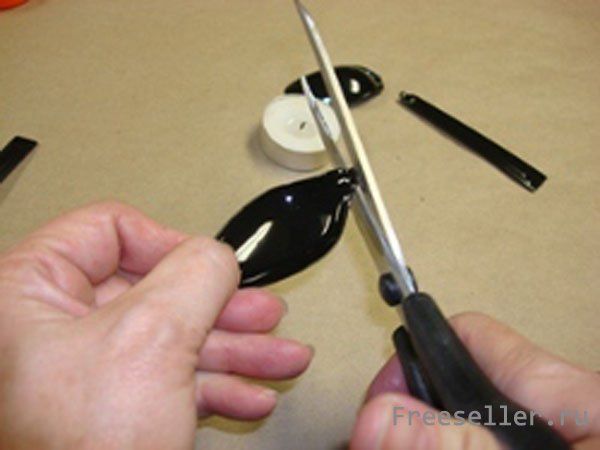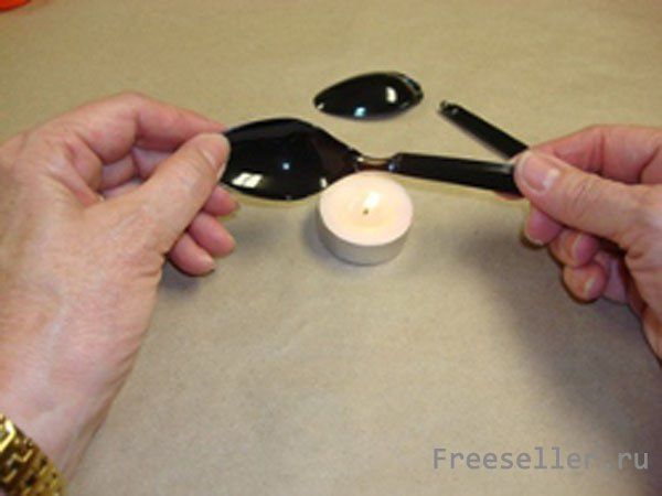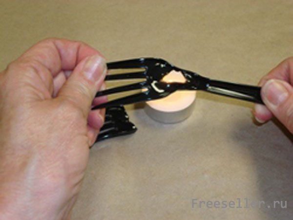 11) Для ног вам необходимо взять 2 пластиковые вилки чёрного цвета. Чтобы отсоединить основу от ножки, вилки нужно держать над пламенем свечи как раз в том месте, где начинается ножка. Как только свеча нагревает пластик, вы можете отсоединить основу от ножки. Уберите вилку от огня. Сразу отрежьте оставшиеся кусочки ножки от основы, пока пластик ещё тёплый и мягкий.
