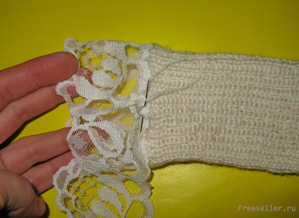 5) Вырезаем из кружевного полотна полоску с цветами и пришиваем с помощью иглы на напульсник.