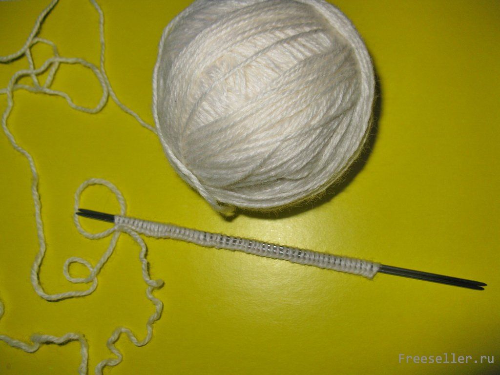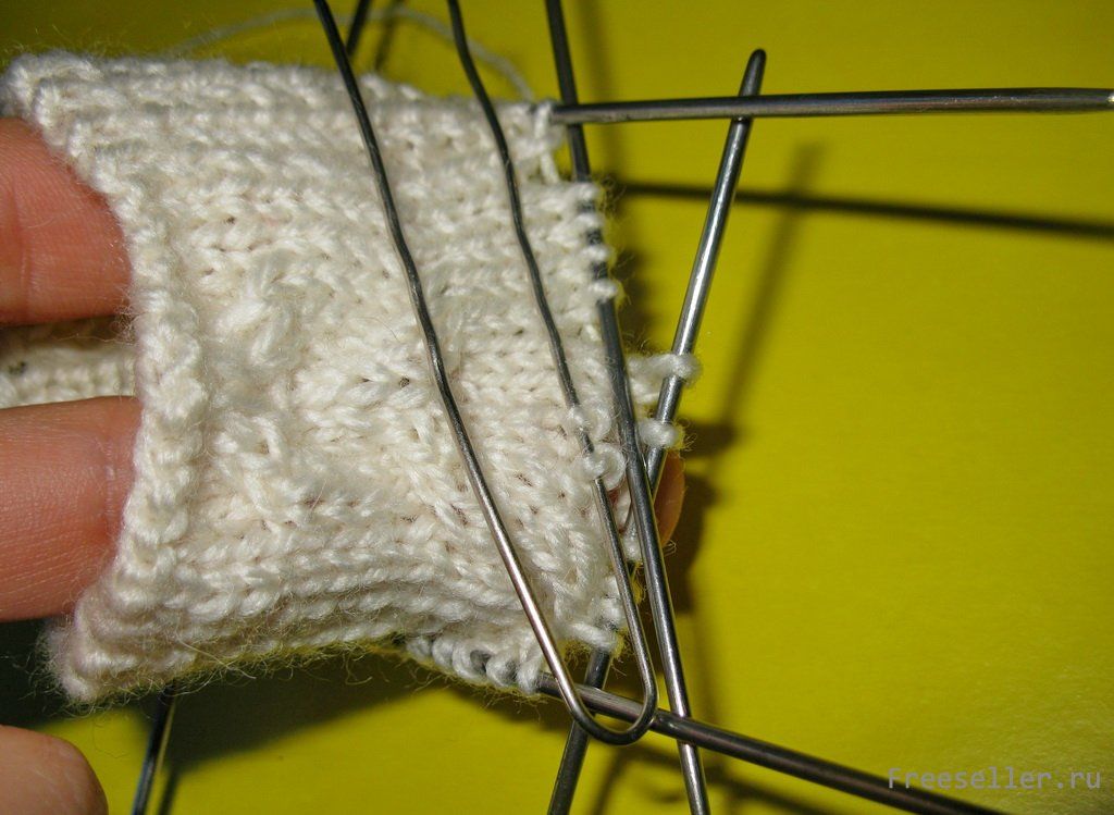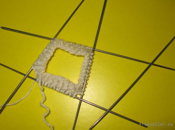 2) Распределяем петли поровну на 4 спицы, связываем концы нитей, образуя замкнутый круг; вяжем по кругу 4 ряда;