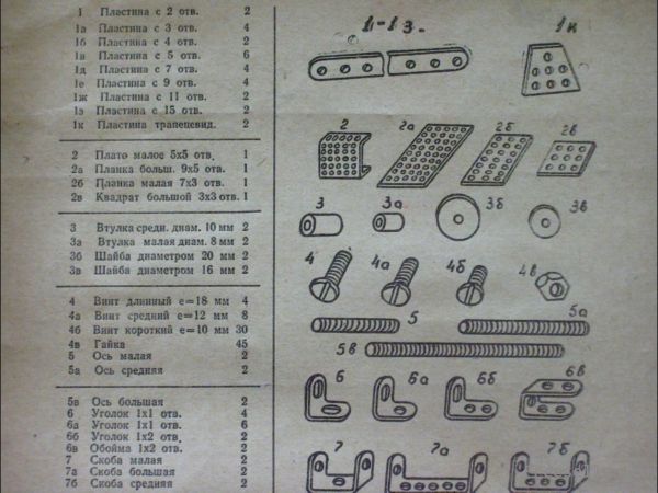 Итак, обнаружив на маховом колесе машинки два сквозных отверстия на примерно равном расстоянии от центра, мы поняли, что дело за малым - ручку есть, куда прикрепить, нужно только саму её сконструировать. Тут-то мы и вспомнили о конструкторе. Порылись в кладовке, отыскали его, а также два длинных винта с гайками для крепления ручки, деревянную рукоятку (тоже раритет - выпущена РСТ БССР в 1976 году!), шуруп и кусочек стирательной резинки.