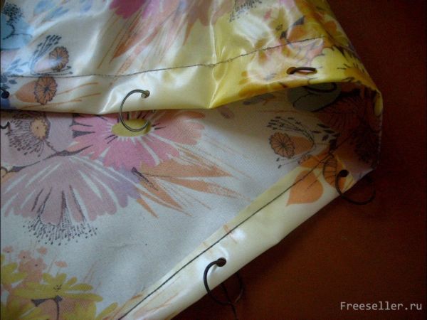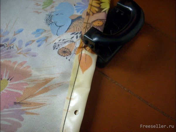 Выкраиваем из клеёнки штору нужной длины. Подшиваем её верхний край для прочности. С помощью дырокола делаем в нём шесть (или сколько нужно по ширине вашей шторы) отверстий. Вдеваем в них кольца.