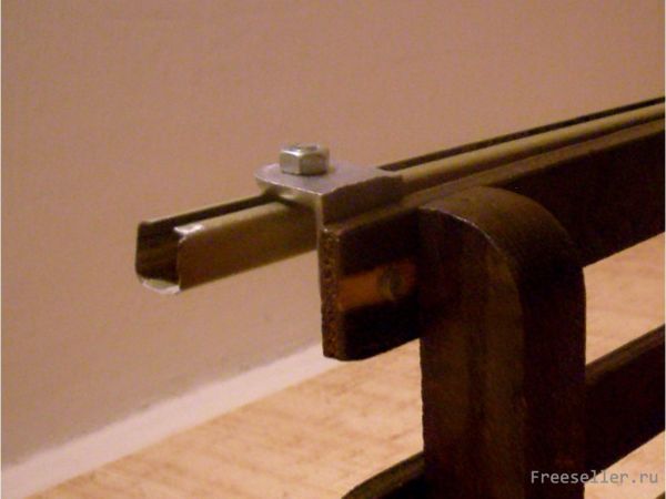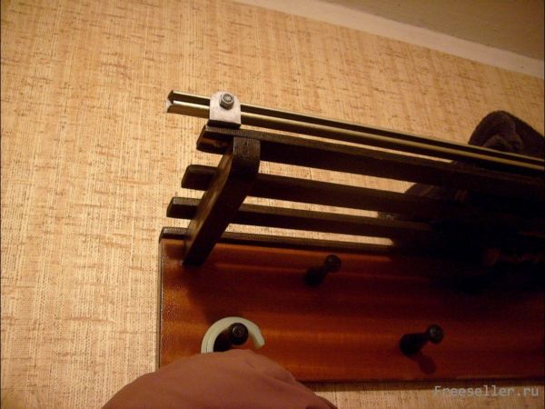 Наш карниз внутри полый. Вводим винты с широкими головками с обеих его сторон вовнутрь и прикручиваем мебельные уголки близко к краю. Разметив на нужном расстоянии точки, прикручиваем уголки к полке вешалки шурупами.