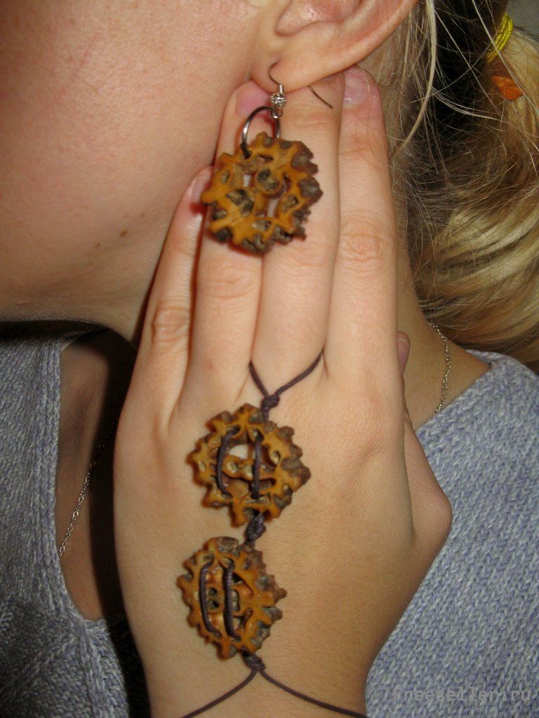 5) В разрезанные кольца ореха вставляем колечки и вешаем их на заготовки для сережек - получаются серьги;