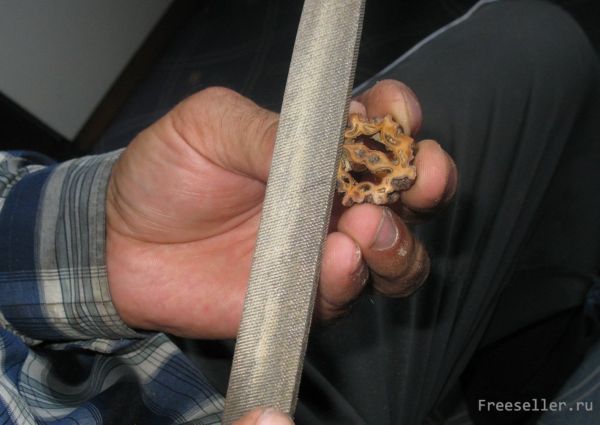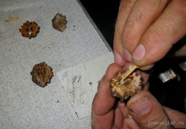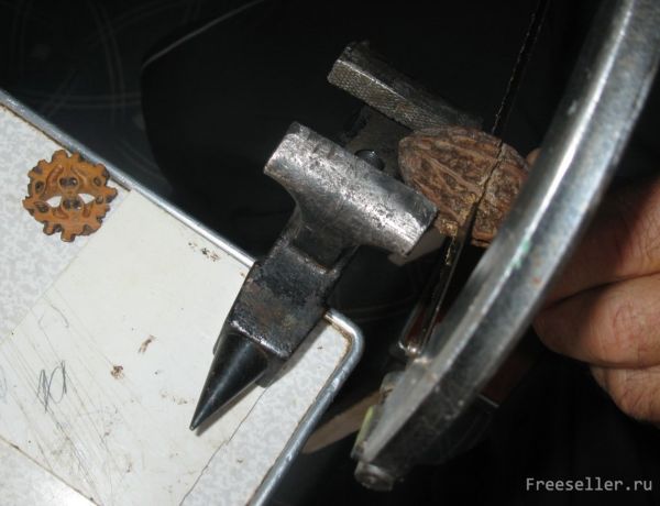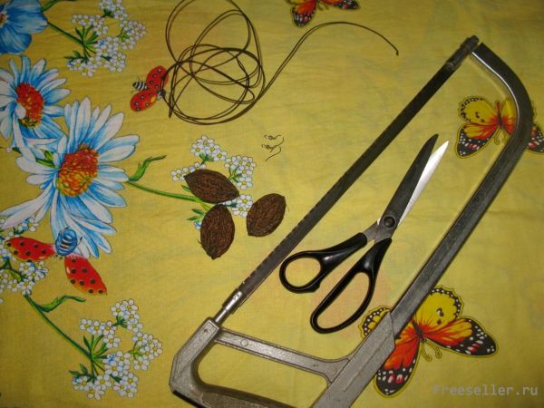 1) Прежде всего, находим орех, зажимаем в тиски и с помощью ножовки распиливаем кольцами;