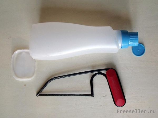 1) Первый шаг достаточно прост. С помощью ножовки вам просто нужно будет отрезать дно бутылки и верх крышечки, как показано на фотографии. Помните о том, что перед тем, как их отрезать, бутылку и крышку нужно хорошенько промыть и протереть сухой тканью. Если понадобится - вымойте бутылку с мылом, или моющим средством для посуды, чтобы избавиться от другого запаха, который может быть весьма неприятным.