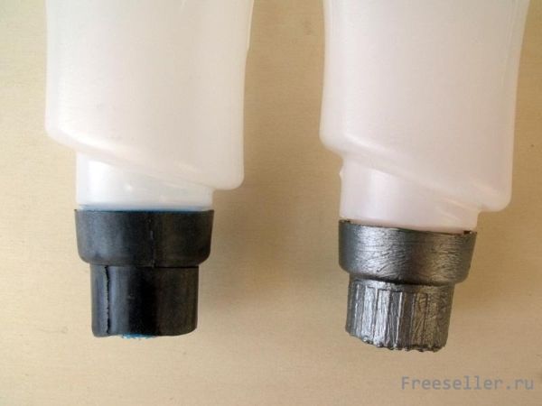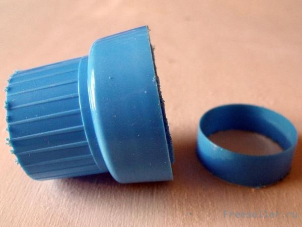 6) Как только с кольцами будет закончено, наденьте поверх крышку от бутылки. Обычно, насколько можно заметить, любая крышка имеет неприятный пластиковый цвет. К примеру, синий или красный. Нам же нужно будет придать ему другой цвет. Для этого достаточно будет взять акриловую не смывающуюся краску серого или серебристого цвета, и покрасить ею крышку. Если таковой не имеется, то просто наденьте на крышку ещё одно-два кольца, вырезанные из внутренней части велосипедной шины.
