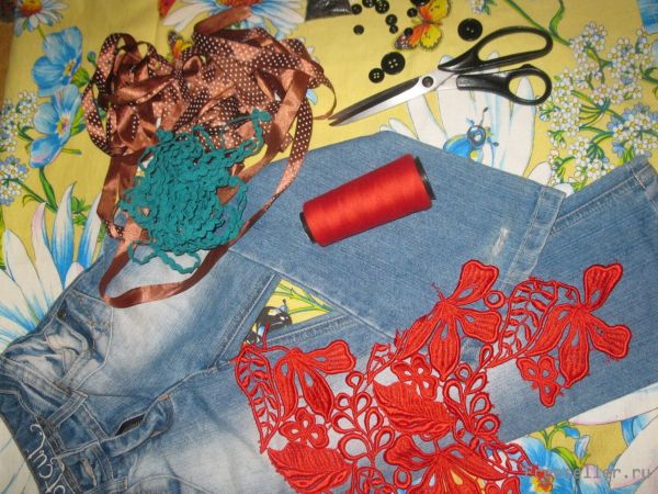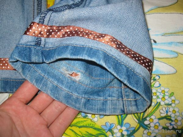 1) если брючина протерлась снизу горизонтально, то это место можно замаскировать ленточкой, если дырка на колене, то прикрываем ее картинкой-аппликацией; чтобы нити из места разрыва не торчали, нужно обязательно закрывать дырку с двух сторон (!); поэтому сначала пришиваем тесьму с изнанки брючины;