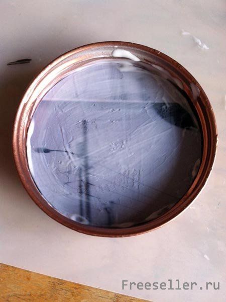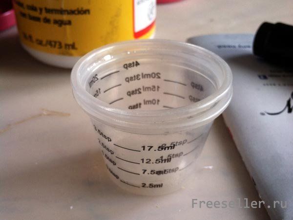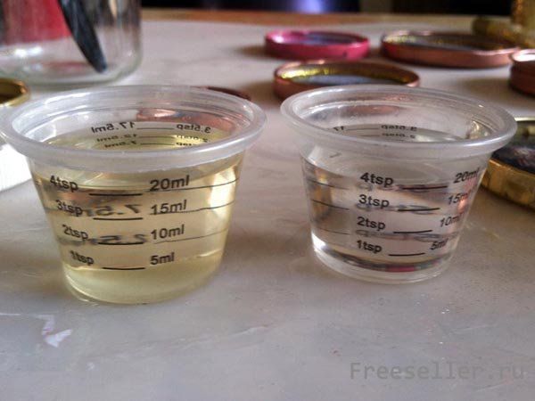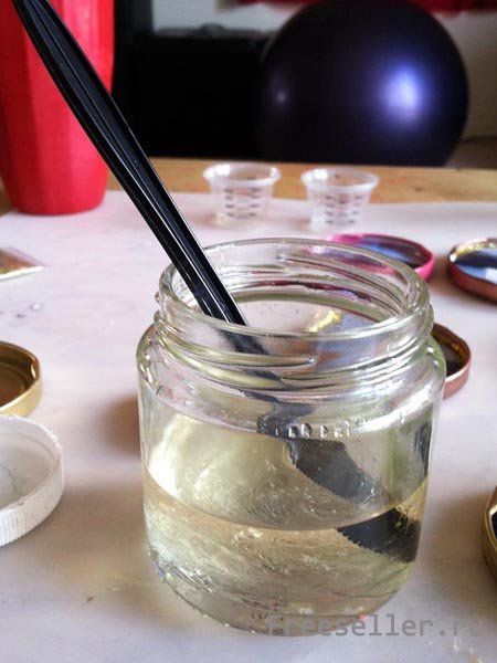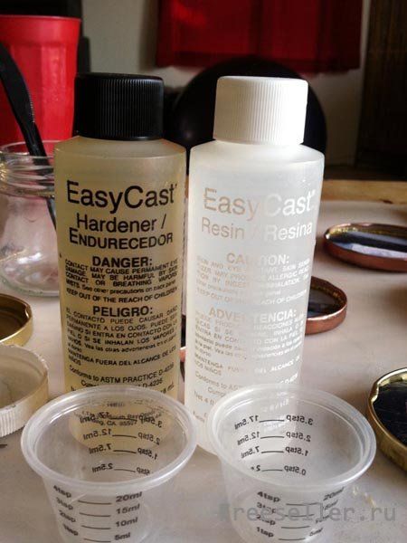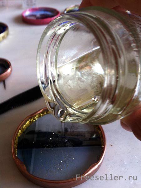 5) Осталось несколько шагов. И этот - самый важный! Обычно эпоксидная смола продаётся в одной упаковке, но при этом состоит из двух частей, что разлиты в две бутылки. Вы должны тщательно и точно с помощью детских мерных кружек для сиропа измерить равное количество обеих жидкостей эпоксида. После этого смешайте их вместе в любой баночке. Учтите, вы обязательно должны смешать равные части обеих составных. В противном случае у вас просто получится липкая смесь, но не необходимая смола. Не имеет значения, сколько вы будете смешивать составные. Главное, делать это до тех пор, пока обе части не будут равны. Ту смесь, которая у вас получится, перемешивайте в течении одной минуты по часовой стрелке. После остановитесь и двигайтесь уже против часовой стрелки еще с минуту. Затем разлейте смесь по крышкам. Заливать её нужно до тех пор, пока она не достигнет вершины.