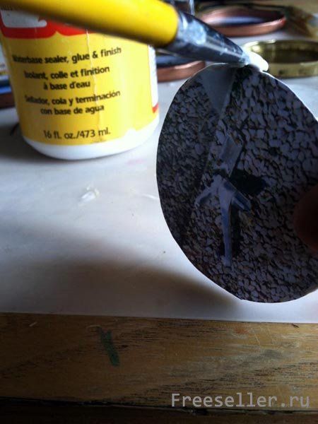 3) После того как вы тщательно покроете переднюю, заднюю и боковые части ваших изображений и позволите основе или клею высохнуть, нанесите клей на заднюю сторону изображений и поместите их вовнутрь крышек. После того, как клей высохнет, и изображения будут надёжно приклеены, нанесите ещё один слой прозрачной основы или клея.